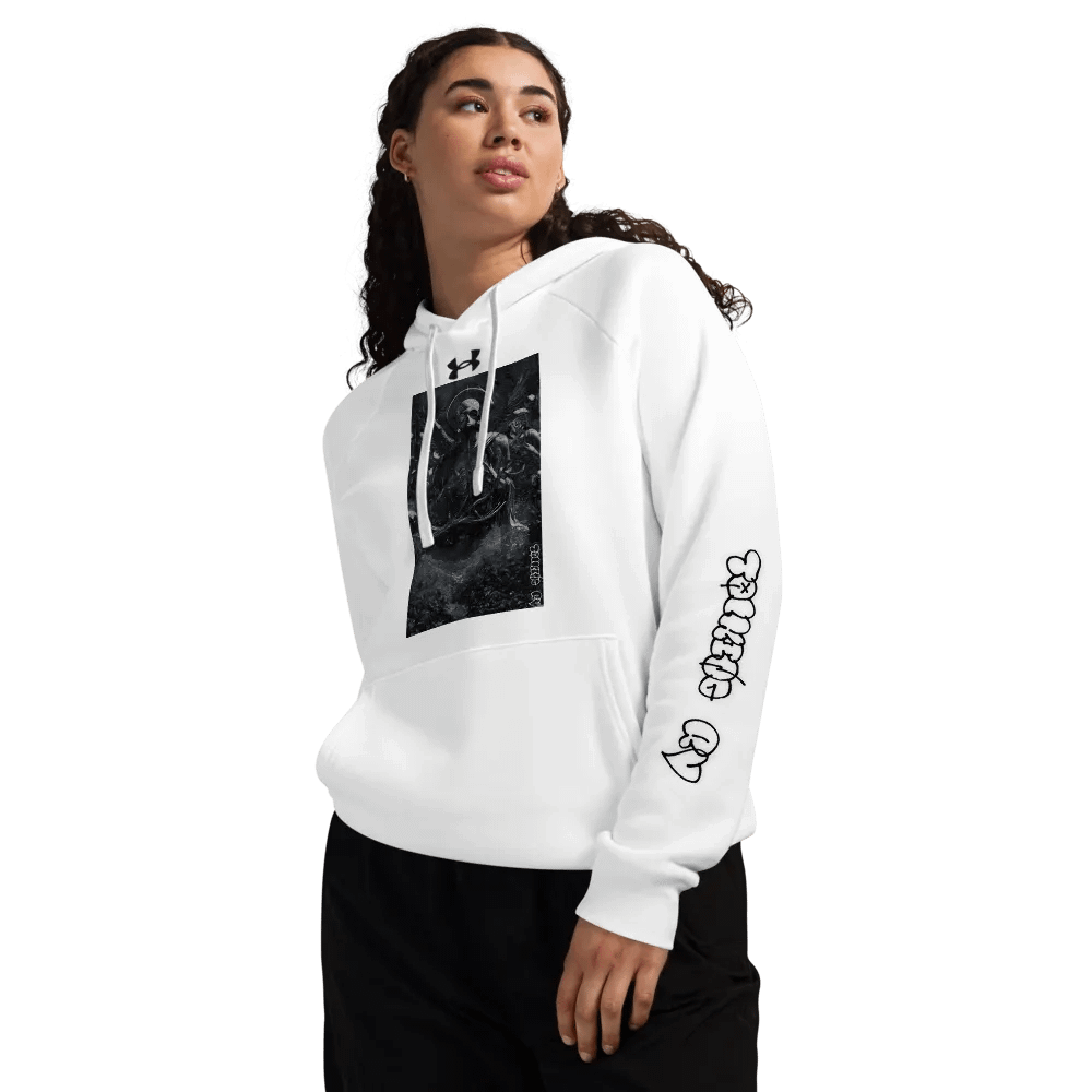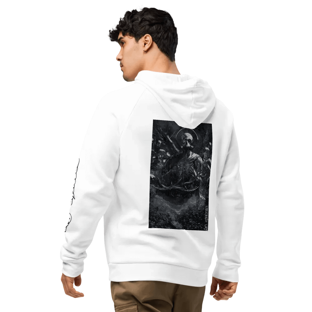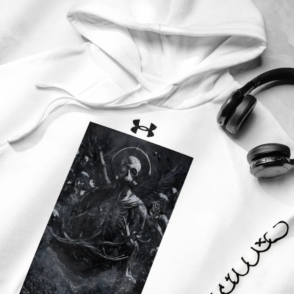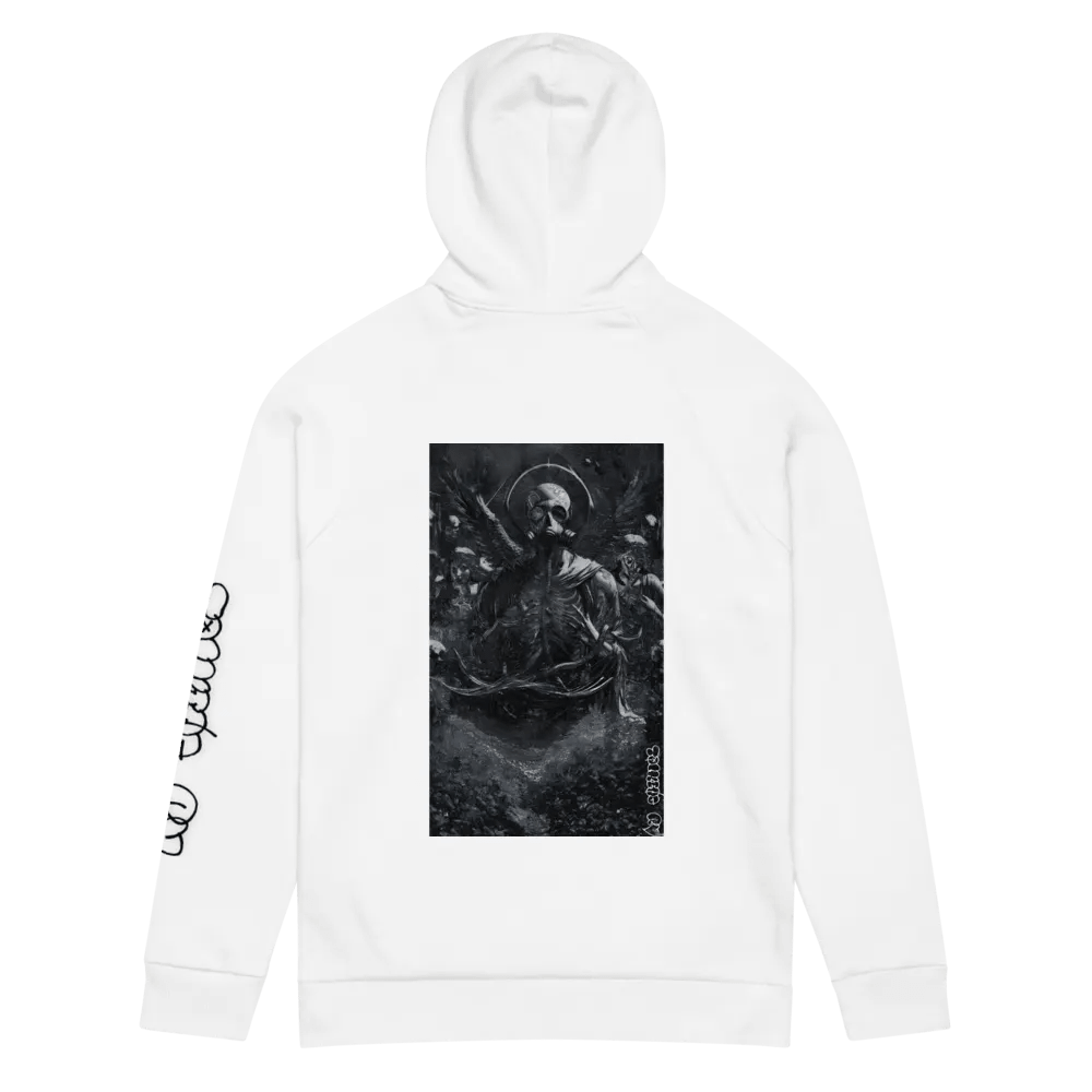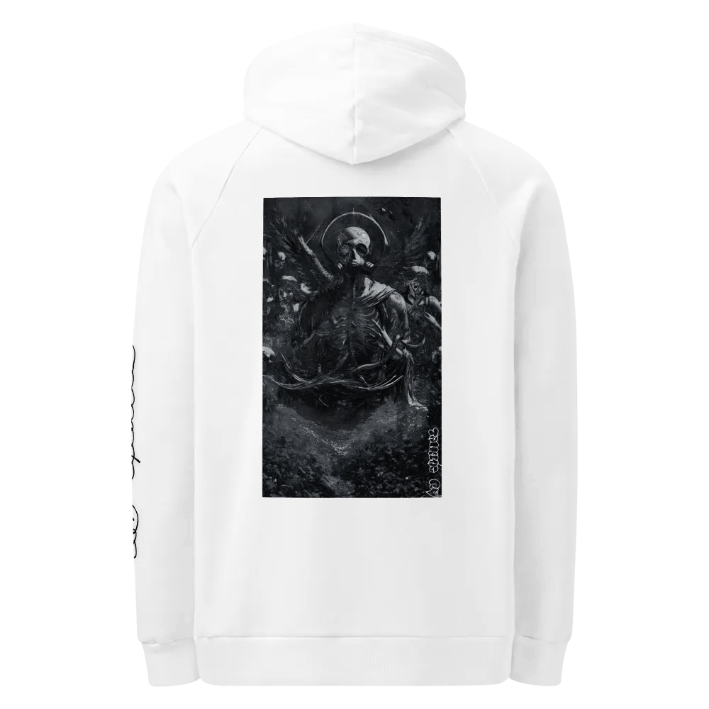 Embrace the future with our Heavenly Oblivion Unisex Hoodie. Crafted from premium cotton blend fleece, this regular fit hoodie features a dynamic graphic artwork of a Gas Mask Angel, front pouch pocket, and ribbed cuffs. Join the futuristic trend in style. From TalkingRV.